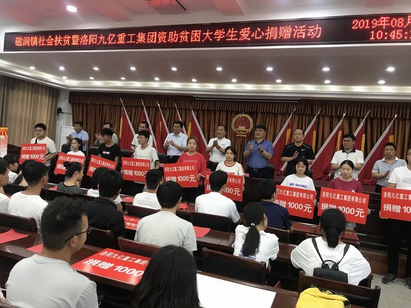 愛是與生俱來的,在血液里流動,在骨子里結晶,它源源不斷的由心而生,永不枯竭,只要人人都愿意奉獻一點愛,就如甘霖沐浴大地,人間處處盛開幸福之花! 為響應洛陽市政府精準扶貧政策,洛陽九億重工集團有限公司及董事長王九茂積極參與捐資助學的慈善義舉活動,特做出如下決定:1、公司幫扶磁澗鎮2017年新招貧困大學生21名順利入學,每人資助2000元,總計肆萬貳仟元整; 2、總經理王九茂(縣政協委員)以個人名義資助磁澗鎮南窯村2017年新招大學生6名,總計12000元整; 我相信,在社會各界的大力支持和共同努力下,我們的“愛心助學”活動將會惠及到更多的同學,為了夢想,刻苦讀書、報銷祖國,廣大同學也一定會在溫暖的社會大家庭里茁壯成長,必將成為國家建設的有用之才! 洛陽九億重工集團有限公司 董事長:王九茂